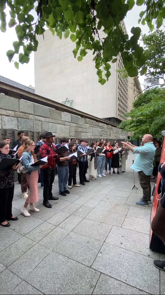 Dr. Thomas Juneau leads the choir in a performance outside the Shoah Holocaust Memorial in Paris. (Photo courtesy of Jade Schoenfeld)