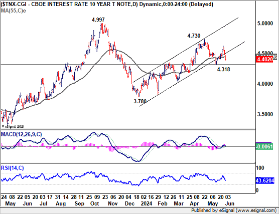 Technically, as long as the 4,318 support holds, the 10-year yield’s retracement from 3,780 is still in favor of an extension to 4,730 at a later stage. However, as this rise is seen as the second leg of the corrective pattern from 4,997, strong resistance should be seen below to limit the upside. The sustained break of 4,318 will indicate a short-term reversal and turn bearish in outlook.